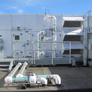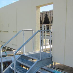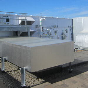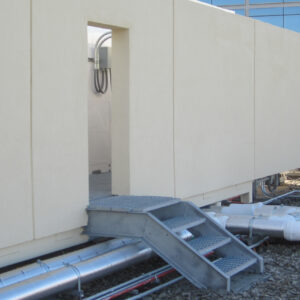 Estructure provided structural engineering services for the AHU and Chiller Equipment Upgrade at 900 Blake Wilbur, Stanford, CA. Two existing rooftop AHUs were replaced with one larger AHU sized to serve the entire building. An existing chiller was also replaced. Estructure identified early in the design that the lightweight roof framing would not be able to directly support the heavy AHU. To bypass the existing roof framing, Estructure designed an elevated steel platform. This platform spans to the existing building columns and allowed the design to proceed without triggering strengthening of the existing roof framing. Construction occurred while the building remained occupied. To minimize system downtime, the platform was designed for phased construction, allowing for immediate installation of the new AHU upon removal of the existing unit.
